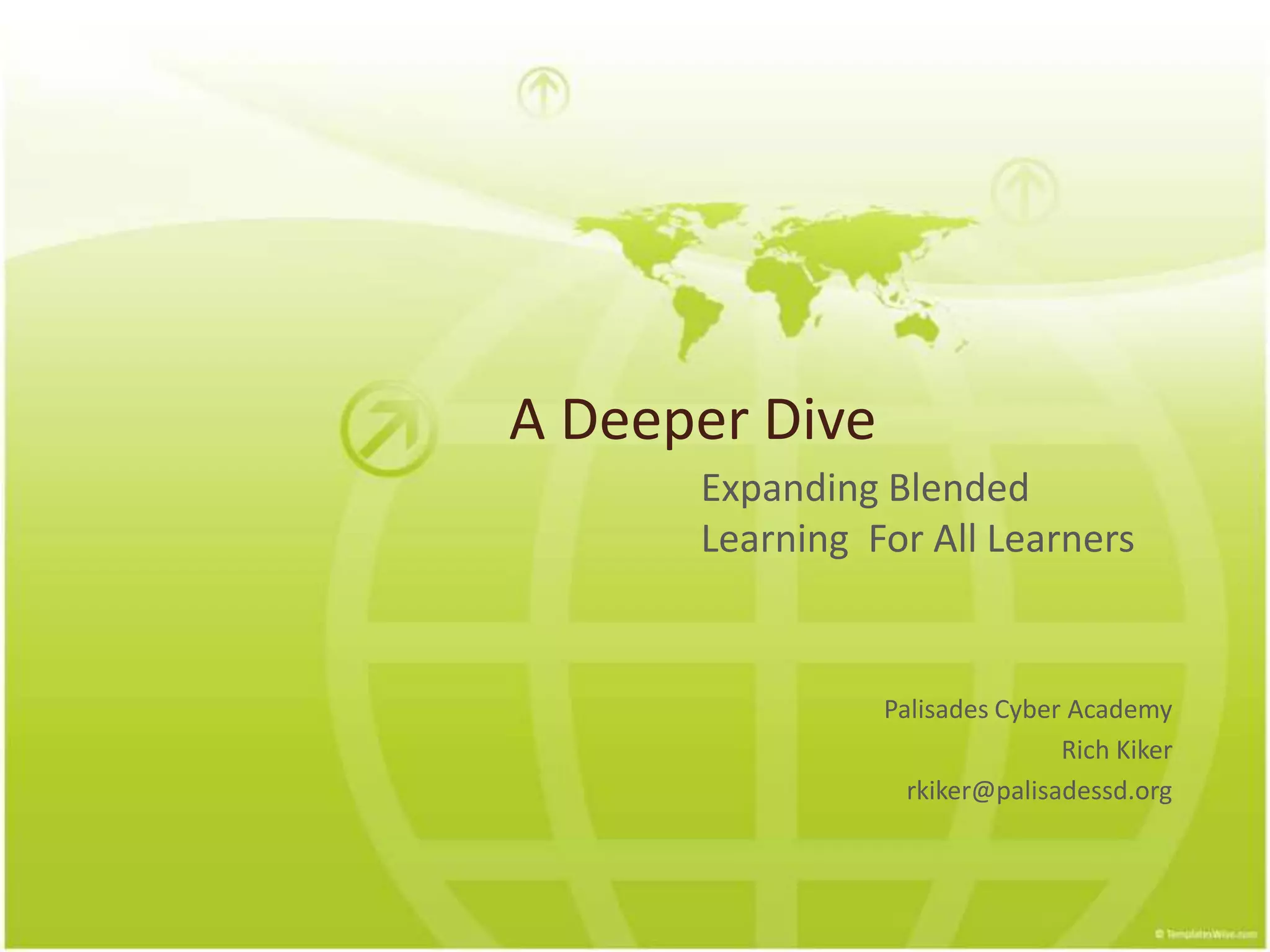 This document summarizes the expansion of blended learning programs at Palisades Cyber Academy. It discusses how the academy started in 2011 providing K-12 cyber options and has since expanded to include cyber centers, online credit recovery, blended computer programming courses, and partnerships with other school districts. The academy aims to identify students needing remediation early and designs individualized learning plans. Future plans include integrating massive open online courses, fully blended curriculums, summer session credit programs, and early graduation/degree options. The director advocates asking why current practices cannot be improved and taking risks to push the boundaries of creativity in education.