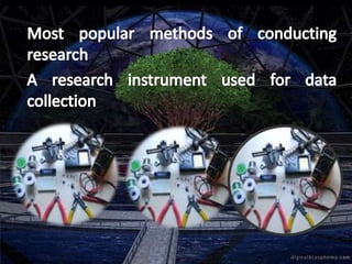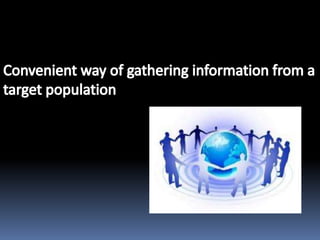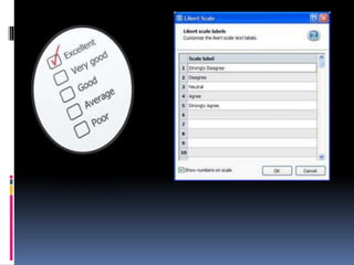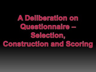 This document provides information on designing questionnaires for research. It defines what a questionnaire is and discusses different types of question formats including open-ended, partially open-ended, and closed-ended questions. Examples are provided for each question type. Guidelines are outlined for developing a good questionnaire, including sequencing questions logically and avoiding biases or sensitive topics. Both advantages and disadvantages of using questionnaires are described.