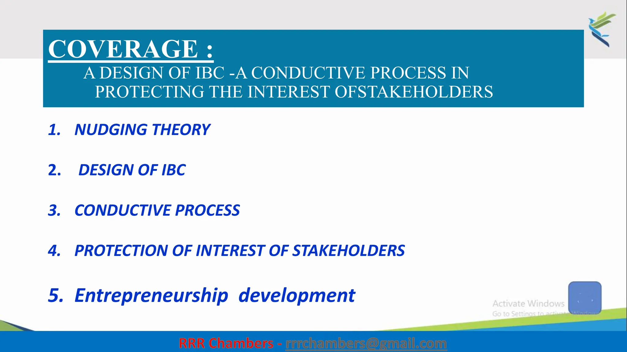The document outlines the design of the Insolvency and Bankruptcy Code (IBC) as a process for protecting stakeholder interests in India. It discusses nudging theory and its application in changing perceptions and behaviors within organizations, focusing on enhancing corporate governance and promoting entrepreneurship. Key objectives include fixing timelines for insolvency resolution, maximizing asset value, and balancing stakeholder interests through a structured and transparent approach.