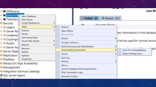 Karen Lopez, a database designer with over 20 years of experience, discusses important security and privacy features in SQL Server and Azure, emphasizing the significance of data governance, metadata tracking, and security measures like always encrypted and dynamic data masking. She outlines the importance of every design decision being based on cost, benefit, and risk while highlighting features such as row-level security and ledger tables. The document also reviews Microsoft's Azure Defender for effective database security management, showcasing tools for vulnerability assessments and compliance with legal requirements.