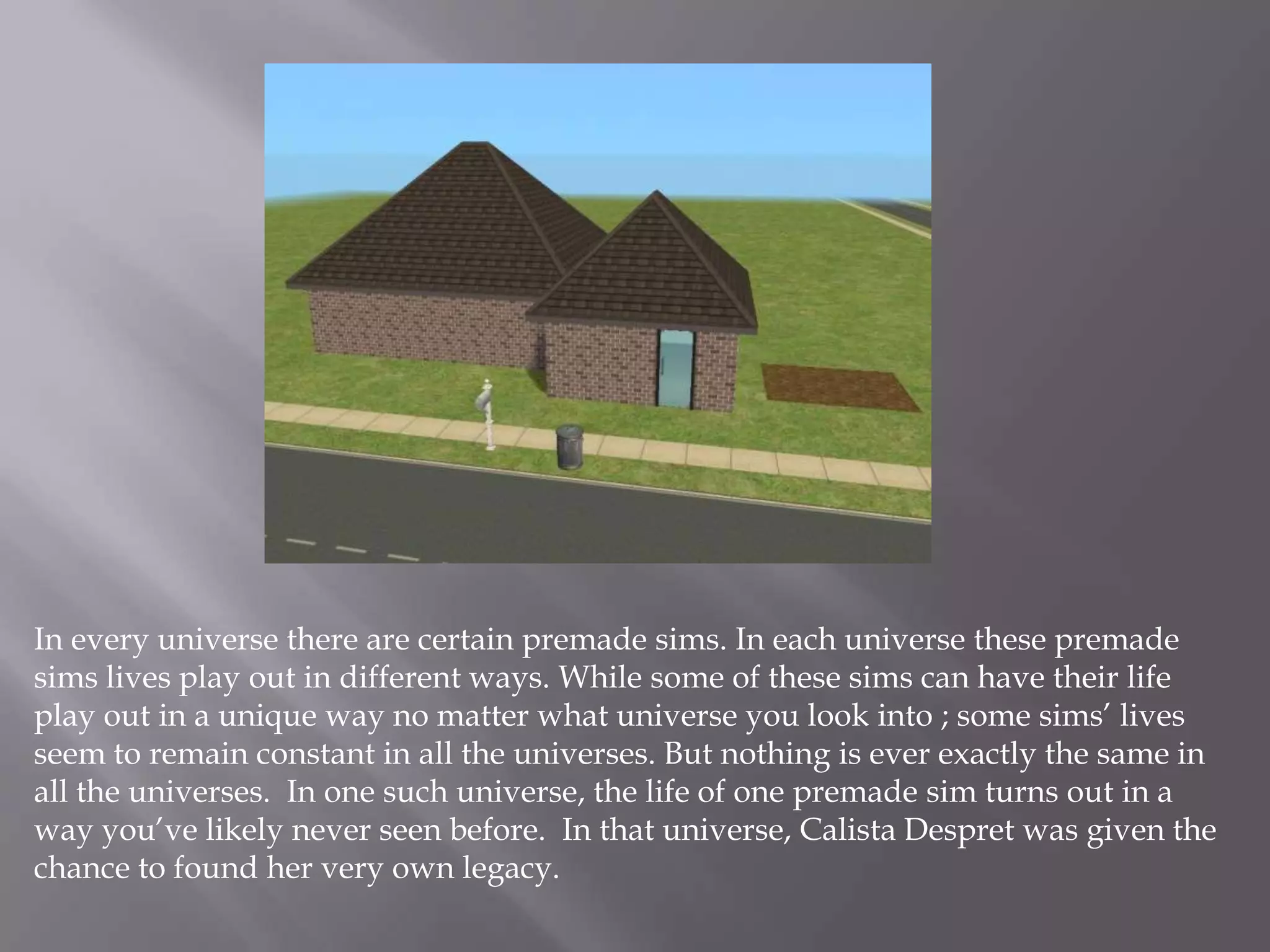 The document tells the story of Calista Despret, a premade Sim in different universes, and her journey to find happiness and a family after being hired as a nanny for the Goldweaver family. Initially struggling to find love, Calista eventually develops a close relationship with Berjes, a bartender, leading to their engagement and decision to start a family together. Their narrative explores themes of second chances, personal growth, and the pursuit of happiness in a virtual setting.