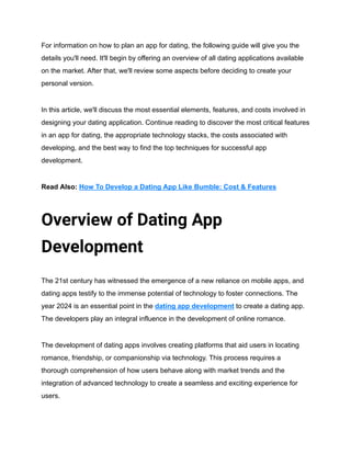 This document serves as a comprehensive guide for developing dating applications in 2024, emphasizing the importance of understanding market trends, user behavior, and technological advancements. It outlines essential steps including defining target audiences, identifying unique selling points, and conducting thorough market research, while highlighting key features that enhance user experiences. The document also discusses the significance of designing a user-friendly interface and adapting to evolving user expectations within the competitive dating app landscape.