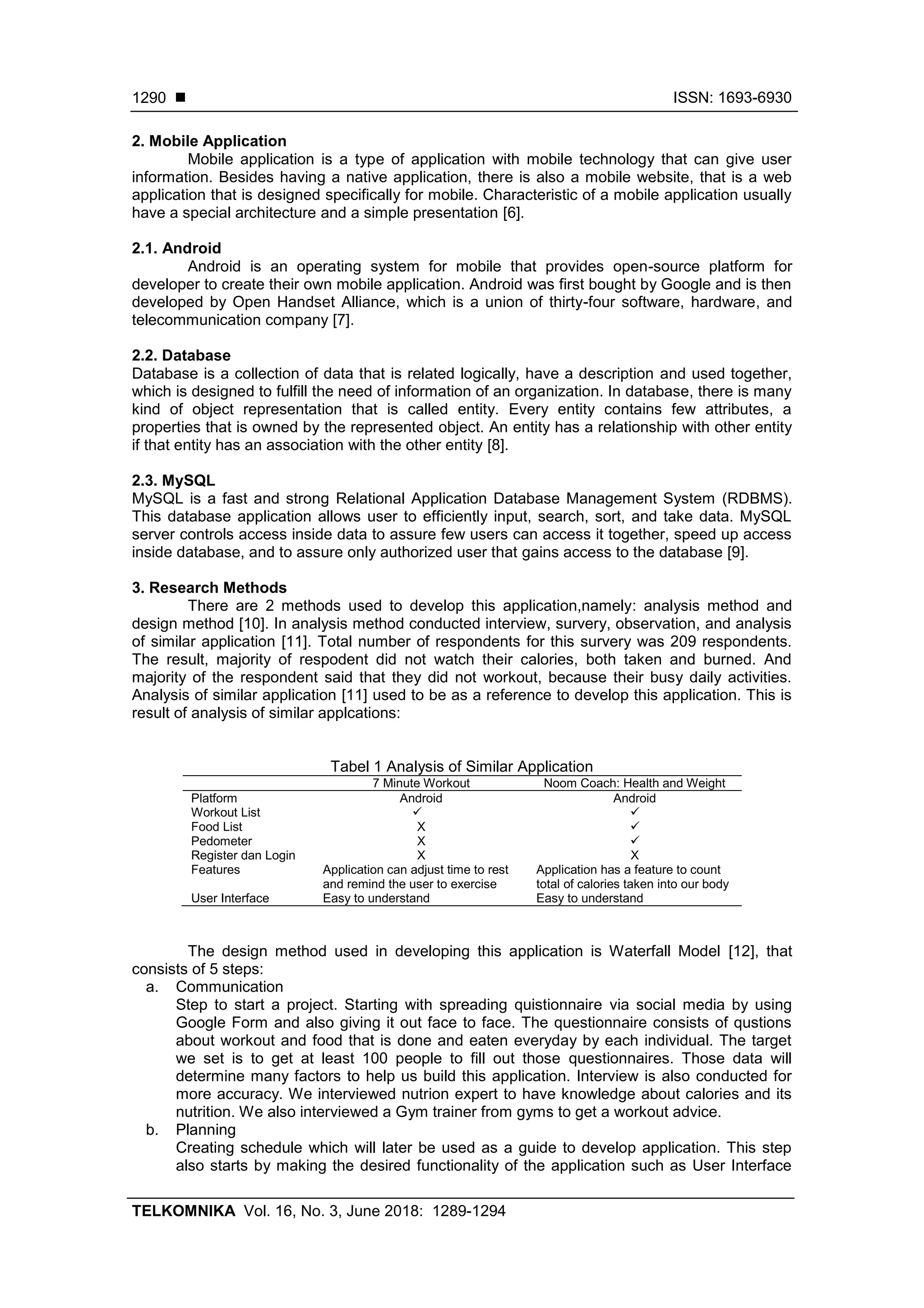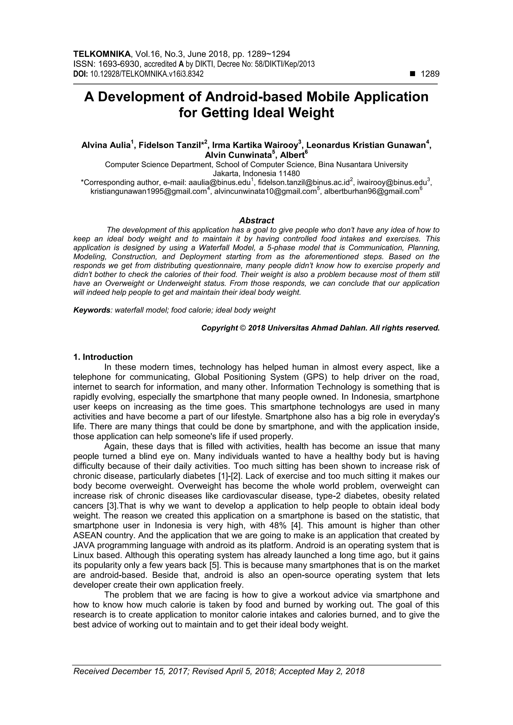 This document discusses the development of an Android-based mobile application aimed at helping users achieve and maintain their ideal body weight by managing food intake and exercise through calorie monitoring. The application was designed using the waterfall model and includes features for tracking calories and workouts based on user input and expert advice. User acceptance tests indicated that the application met usability standards, and the authors proposed future enhancements to improve functionality.