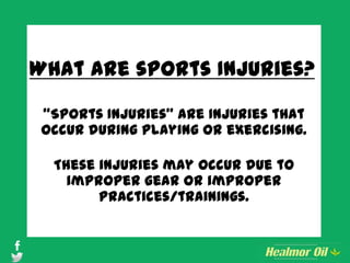 This document discusses the differences between acute and chronic sports injuries. Acute injuries occur during exercise or sports from an external force, with symptoms like strains, sprains, or fractures. Chronic injuries are overuse injuries that develop over time from repetitive motions in activities like running or tennis. The document provides tips for treating and preventing both acute and chronic injuries, such as resting injuries, seeing a doctor for severe pain, stretching properly, using good form, and warming up before exercise.