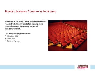 1. Blended learning adoption is increasing as organizations seek cost savings from reducing face-to-face training and increasing e-learning. However, focusing only on cost savings misses an opportunity to improve effectiveness.