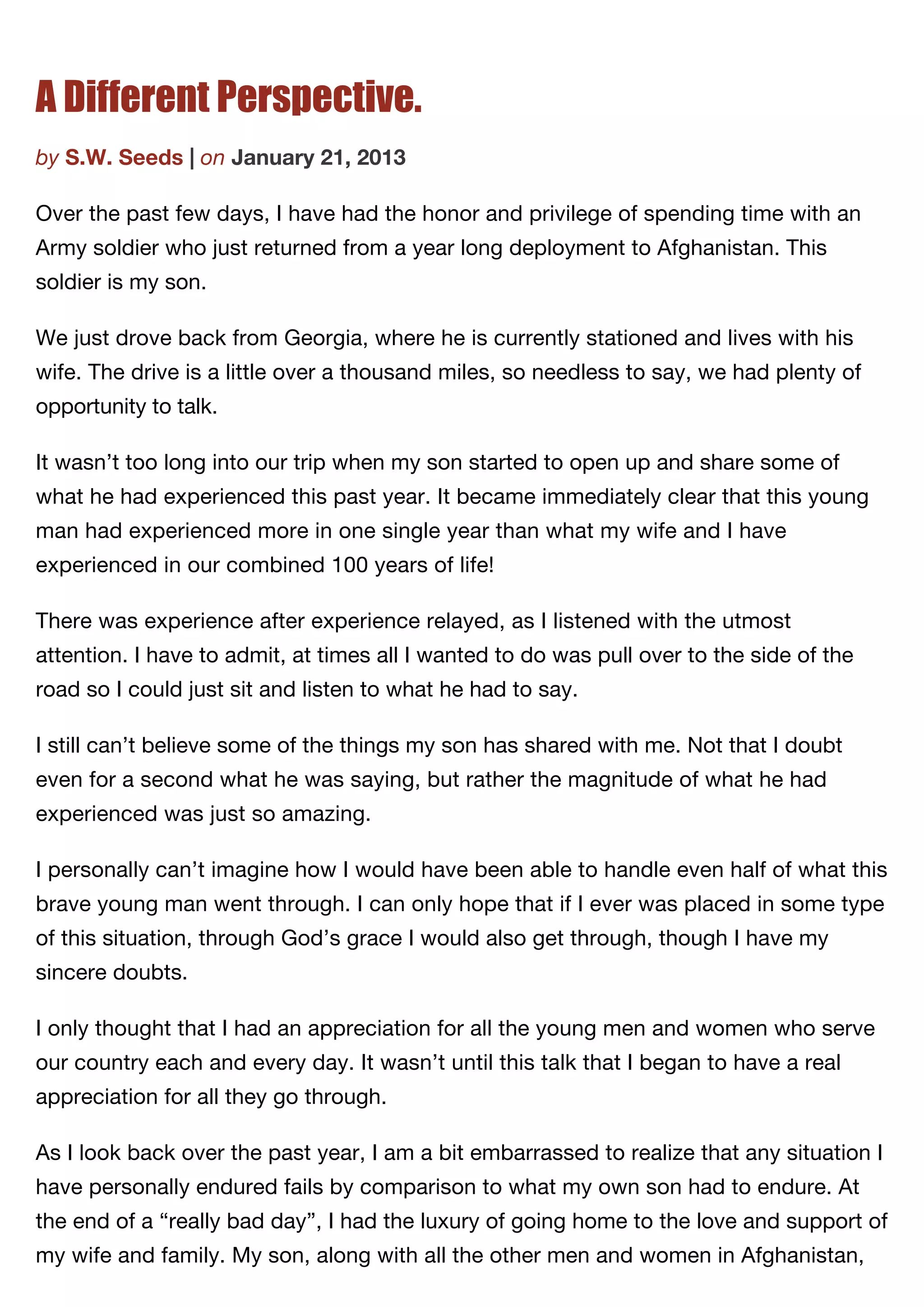 The author recounts driving back from Georgia with his son, an Army soldier recently returned from a year-long deployment in Afghanistan. During the long drive, the son opened up about his experiences, giving the author a new perspective on the sacrifices made by soldiers. The author was surprised by all his son endured during deployment and gained a profound appreciation for what soldiers go through to protect the country's freedom.