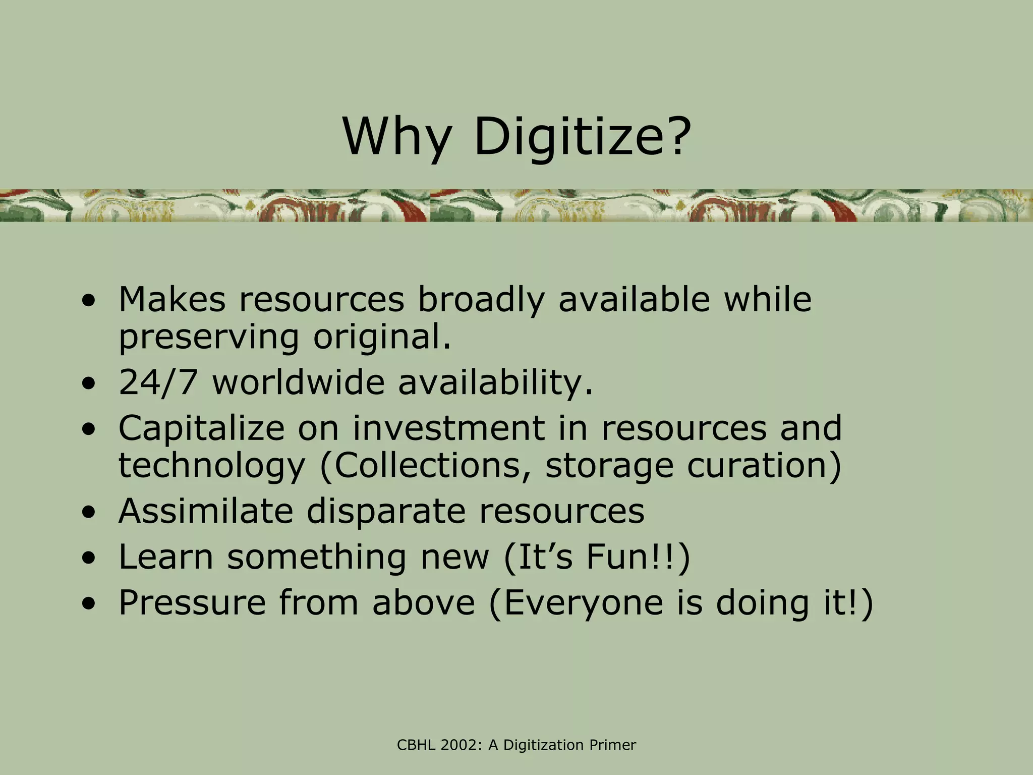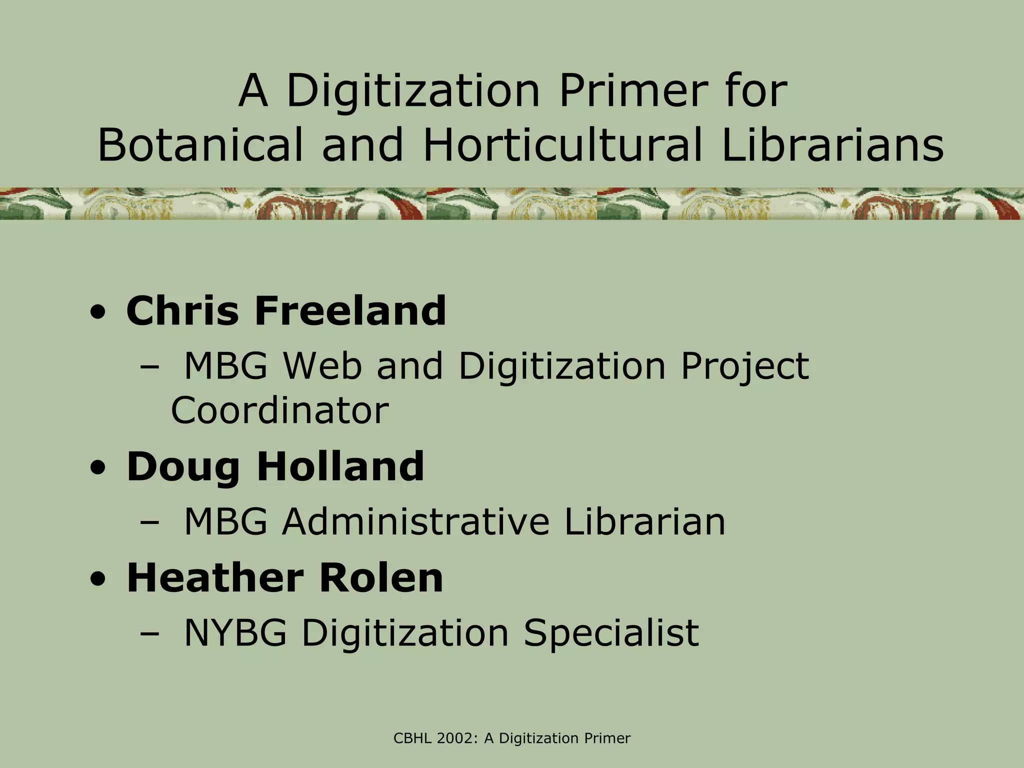 The document provides guidance on developing a digitization project for botanical and horticultural libraries. It discusses why institutions digitize materials, including making resources broadly available while preserving originals. A survey of attendees found most had little experience with digitization projects and were interested in digitizing various material formats, including photographs, printed works, and herbarium specimens. The document outlines topics to cover in developing a project, including audience and goals, ownership and copyright, preservation, metadata, scanning and sustainability.
