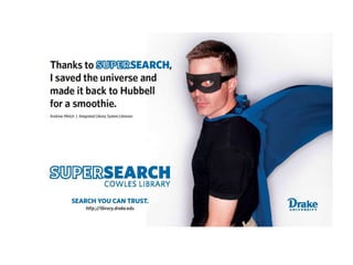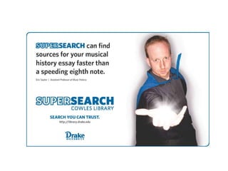 The document outlines a case study on the implementation of the EBSCO Discovery Service at Cowles Library, Drake University, describing 'web-scale discovery' as a method for efficiently searching diverse content. It discusses the project's three-year plan, focusing on deployment, assessment, and review phases, while highlighting user expectations influenced by Google's search interface. Additionally, it emphasizes the importance of adapting library services to align with modern research behaviors and improving student research skills.