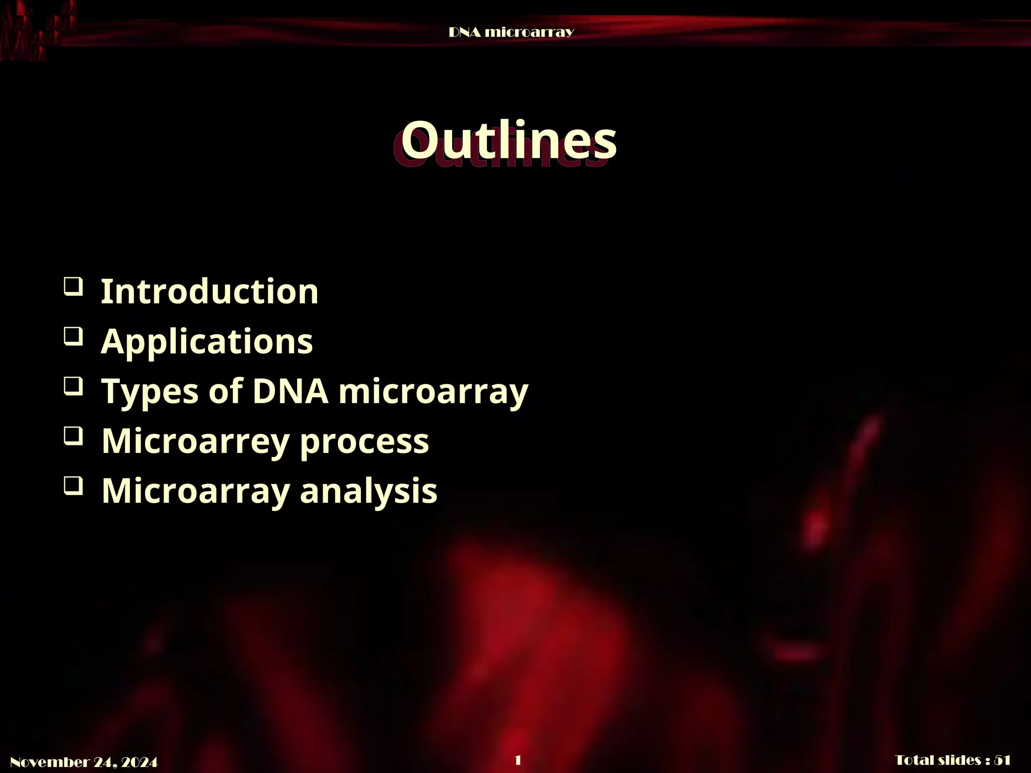 The document details the principles and applications of DNA microarrays, which are tools for monitoring gene expression across thousands of genes simultaneously. It discusses the various types of microarrays, the microarray process, and the analysis of data obtained from experiments, emphasizing their significance in fields like molecular diagnosis and drug development. The document also highlights advancements in microarray technology and the methodologies employed in preparing and analyzing microarrays.