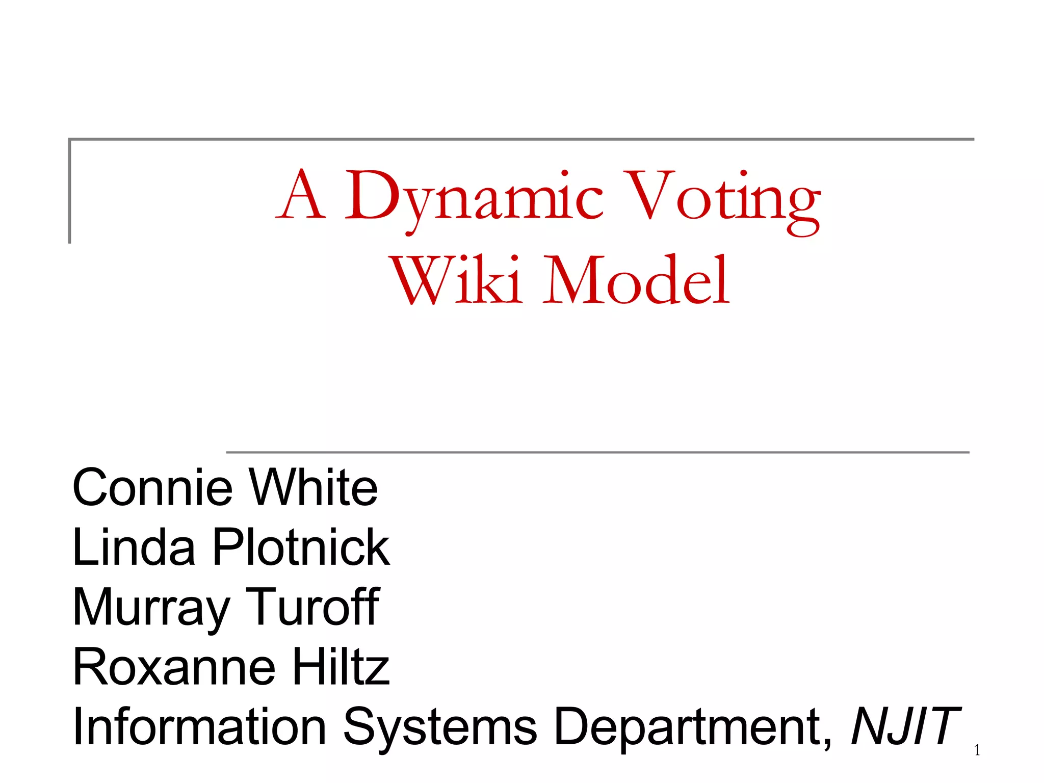 The document proposes a dynamic voting wiki model to improve upon traditional wiki systems for collaborative work. It discusses problems with traditional wikis like credibility issues and "edit wars". The dynamic voting wiki model allows anonymous voting to reach consensus and incorporates real-time feedback through discussion and ability to change votes. An exploratory case study was conducted comparing a wiki only group to a wiki with voting group on a task. The voting wiki group had more discussion, ideas, and addressed disagreements better. The model shows potential for fast group decision making especially in time-critical domains. Further research is suggested using domain experts on an emergency-specific dynamic voting wiki.