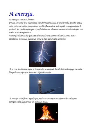 A enerxia. As enerxias e as suas formas: O noso contorno está e continua transformación,desde as cousas máis grandes ata as máis pequenas existe un continuo cambio.A enerxía é todo aquilo coa capacidade de producir un cambio como,por exemplo,iniciar ou alterar o movemento dun obxeto ou variar a súa temperatura. A enerxía electrica:é a que esta relacionada coa corrente electrica,como a que utilizamos nos nosos fogares ou como a dun raio dunha tormenta. A nerxía luminosa:é a que se tranasmite a través da luz.O Sol,o relampago ou unha lámpada acesa proporcionan este tipo de enerxía. A enerxía calorífica:é aquela que producen os corpos que desprender calor;por exemplo,unha fogueira ou un radiador aceso.