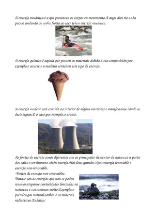 A enerxía mecánica:é a que presentan os corpos en movemento.A auga dun río,unha persoa andando ou unha froita ao caer teñen enerxía mecánica. A enerxía química é aquela que posuen os materiais debido á súa composición;por exemplo,o azucre e a madeira conteñen este tipo de enerxía. A enerxía nuclear está contida no interior de algúns materiais e manifestanse cando se desintegran.E o caso,por exemplo,o uranio. As fontes de enerxía sonos diferentes son os principales elementos da natureza a partir dos cales o ser humano obtén enerxía.Hai dous grandes tipos:enerxía renovable e enerxía nonrenovable. Fontes de enerxía nonrenovables. Tratase son as enerxias que non se poden renovar,atopanse cantwidades limitadas na natureza e contaminan moito.Exemplo:o petroleo,gas natural,carbón e os minerais radiactivos.Enbaixo: