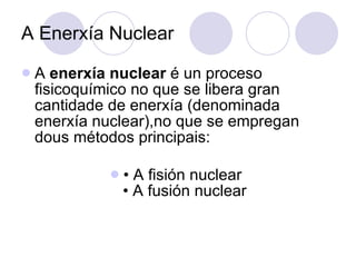 A Enerxía NuclearA enerxía nuclear é un proceso fisicoquímico no que se libera gran cantidade de enerxía (denominada enerxía nuclear),no que se empregan dous métodos principais: • A fisión nuclear • A fusión nuclear
