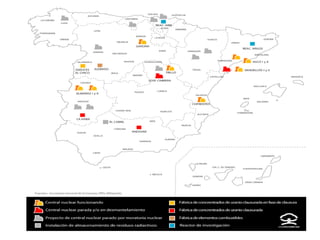 A Enerxía Nuclearen España A Enerxía nuclear en España é a primeira produtora de enerxía primaria nacional e a segunda fonte de xeración de enerxía eléctrica no país.España conta con dez instalacións nucleares. Entre elas, seis centrais: Almaraz I e II, Ascó I e II, Cofrentes, Santa María de Garoña, Trillo I, con oito reactores. Existe, ademais, unha fábrica de combustible nuclear en Salamanca,Juzbado, e un centro de almacenaxe de residuos radioactivos de baixa e media actividade en Córdoba (O Cabril). O desenvolvemento nuclear español comezou durante o Franquismo tras a Segunda Guerra Mundial, de xeito independente. Aínda que oficialmente se trataba dun programa de uso civil, existía a intención secreta de aplicación militar. Non obstante, non foi ata a apertura do réxime no1950 cando se puido proxectar a primeira central.