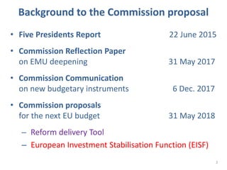 This document discusses the European Commission's proposal for a European Stabilization Function (EISF) and debates around it. The EISF aims to prevent pro-cyclical fiscal tightening during economic shocks, reduce market overreactions, and contribute to EU cohesion. It would provide loans to Member States facing large unemployment shocks, proportionate to shock severity, to fund public investments with interest subsidies. While some are skeptical due to perceived lack of need, the document argues asymmetric shocks do occur and risk-sharing would be improved with public and private mechanisms. The design aims to target severe shocks and avoid moral hazard through eligibility conditions. Charts show many Member States could benefit from the EISF,