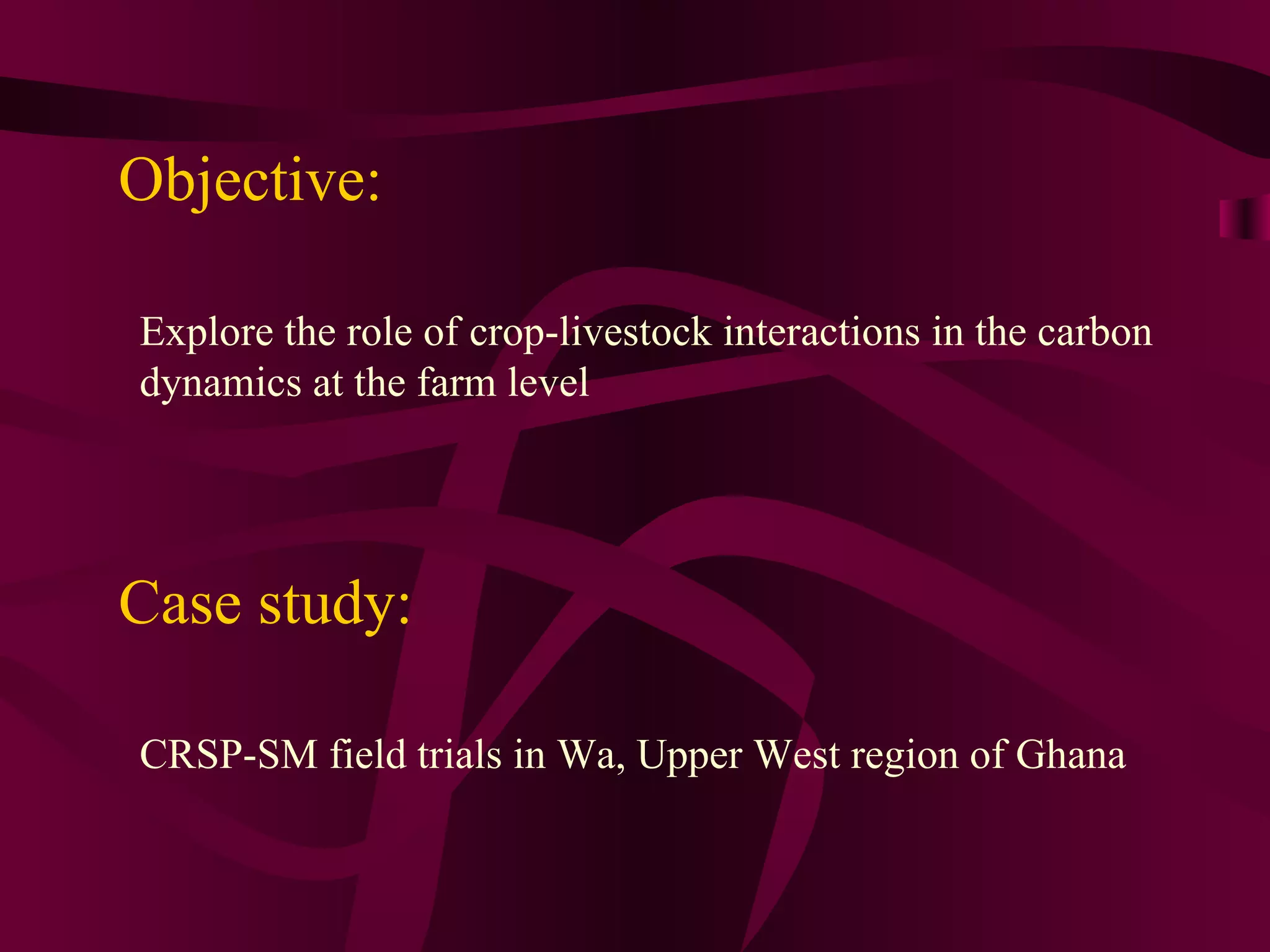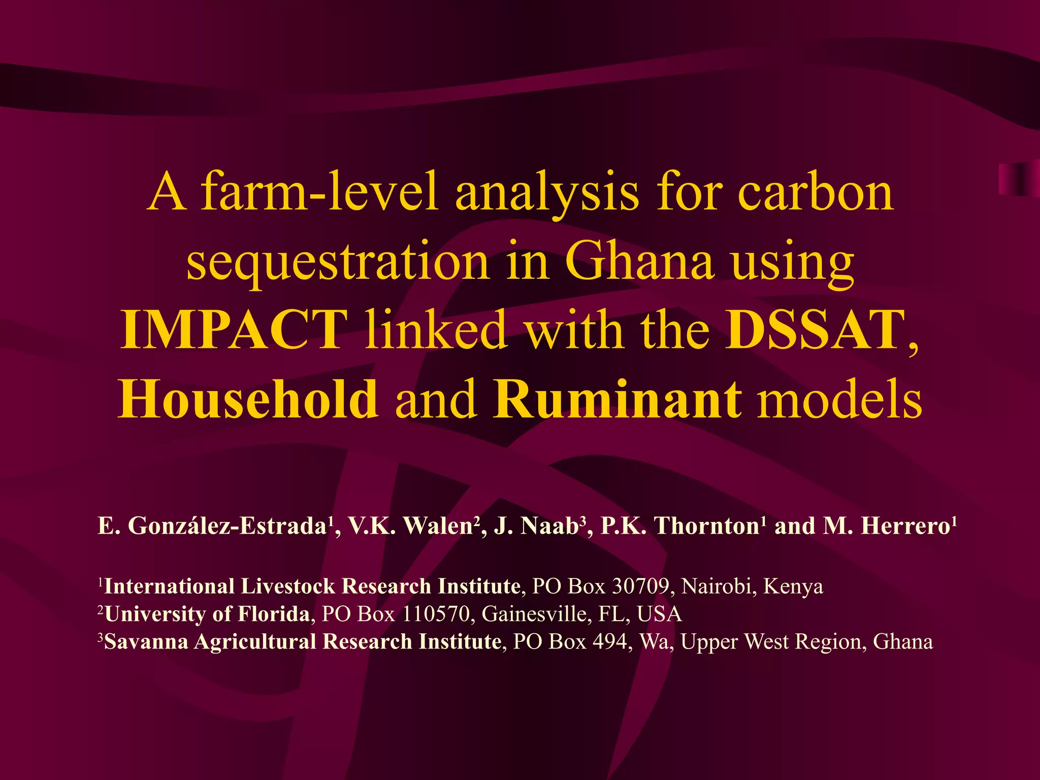The document presents a farm-level analysis of carbon sequestration in Ghana, focusing on crop-livestock interactions using various modeling frameworks. It evaluates household optimization and carbon dynamics, with a case study highlighting food security, net income, and carbon balance across different agricultural practices. Results indicate that improved livestock management and optimized land use could enhance both food security and carbon fixation, while exploring the suitability of households for adopting such technologies.