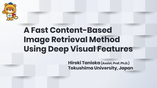 The document describes a fast content-based image retrieval method using deep visual features, focusing on improving efficiency by utilizing normalized vectors and reducing feature dimensions. Key findings demonstrate that pre-normalizing features significantly speeds up cosine similarity calculations, with at least 8 features deemed necessary for effective image searches. Finally, the author provides instructions for using the implemented method in Elasticsearch and shares their GitHub page for further reference.