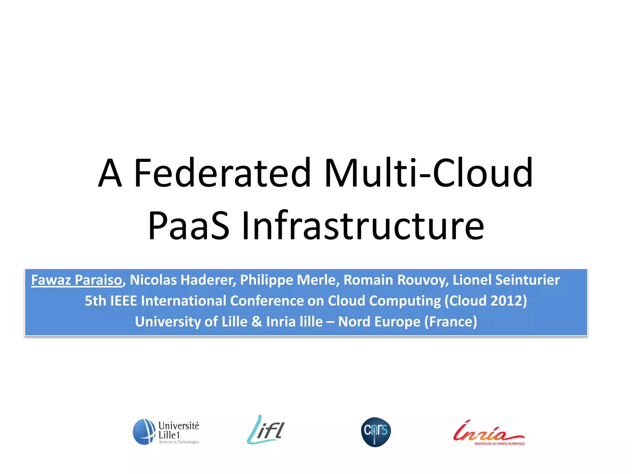 This document proposes a federated multi-cloud Platform as a Service (PaaS) infrastructure to address the challenges of portability, interoperability, heterogeneity, and geographic diversity. It presents a configurable architecture based on a software product line and plug-in systems. A flexible component model using Service Component Architecture allows developing and deploying multi-cloud PaaS and Software as a Service applications. Three sample applications are deployed across multiple clouds to validate the approach.