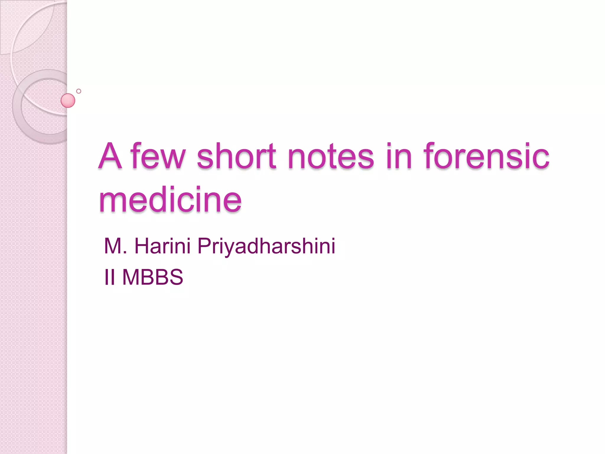 The document discusses various topics in forensic medicine including judicial hanging, brain stem death, and tests for determining live birth. It describes how judicial hanging is carried out through different methods like the short drop or long drop that result in fracture or rupture of the vertebrae or brainstem. It also outlines the legal process and medical tests required in India to diagnose brain stem death. Finally, it lists physical signs examined to determine if respiration occurred after birth, such as chest shape, lung size and color, and changes to the stomach, that could indicate a live birth.