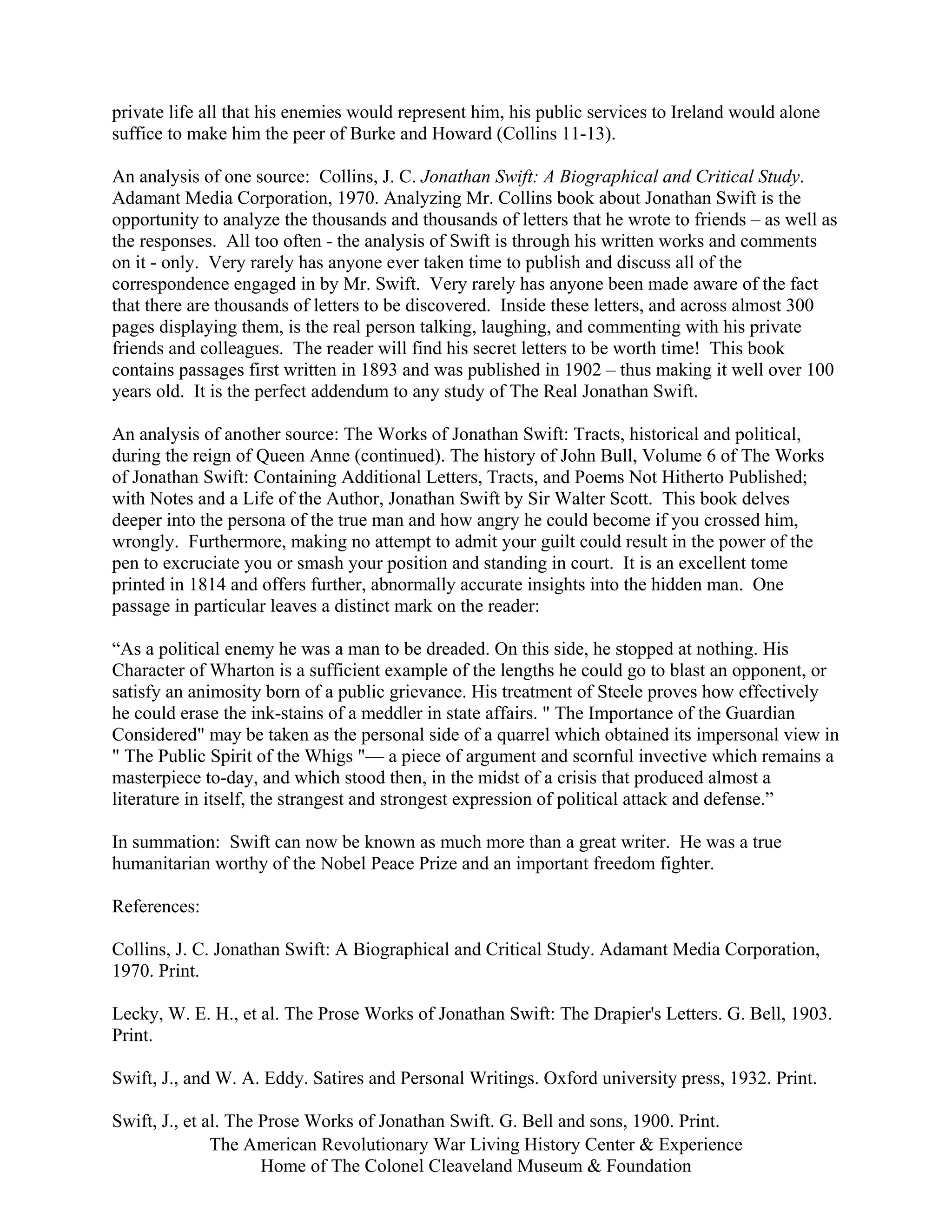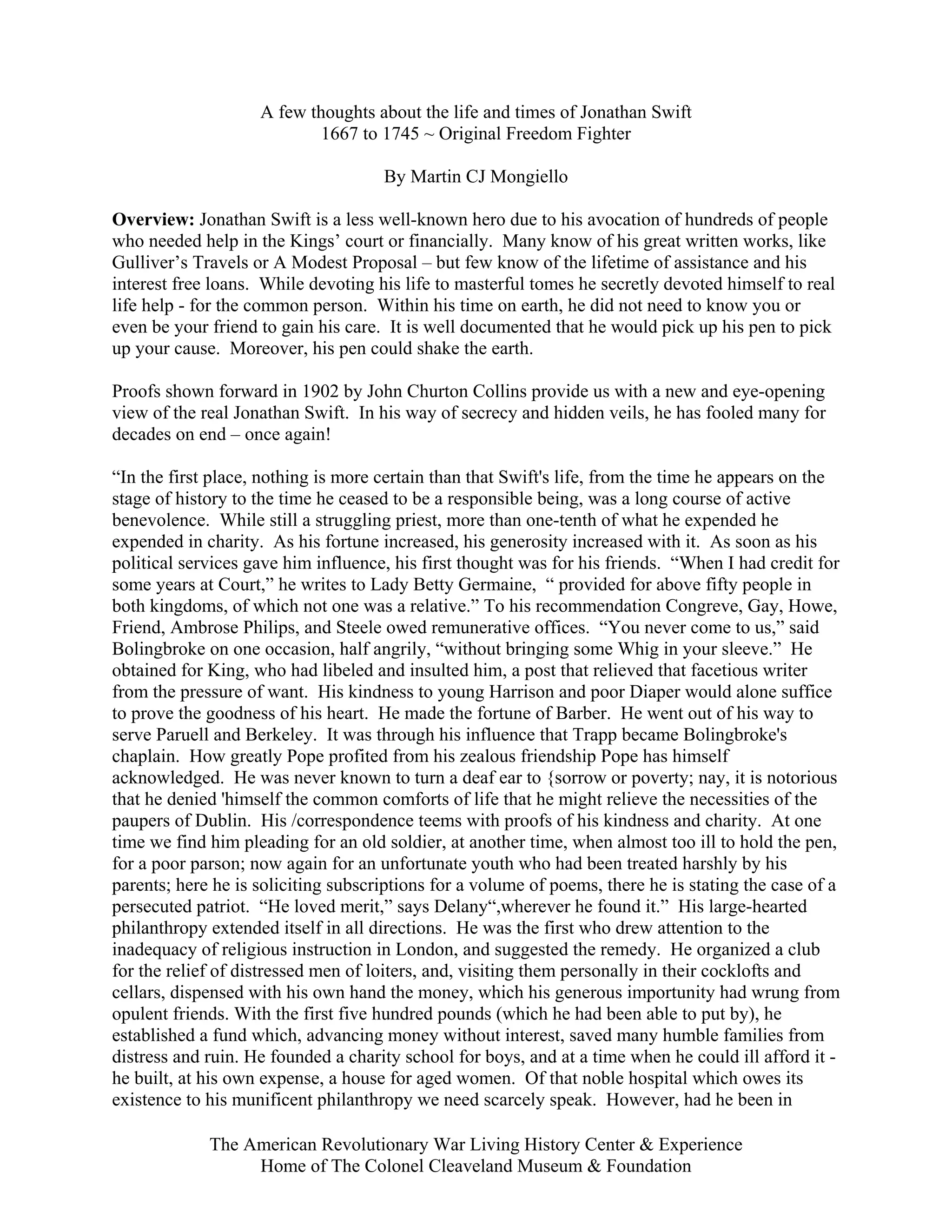 Jonathan Swift was a humanitarian who secretly helped hundreds of people through acts of charity like interest-free loans, despite being best known as a great writer. Analysis of Swift's thousands of letters show him assisting people in need, advocating for the common person. While a skilled political enemy if crossed, Swift was truly devoted to serving others and worthy of recognition for his philanthropic work fighting for freedom.
