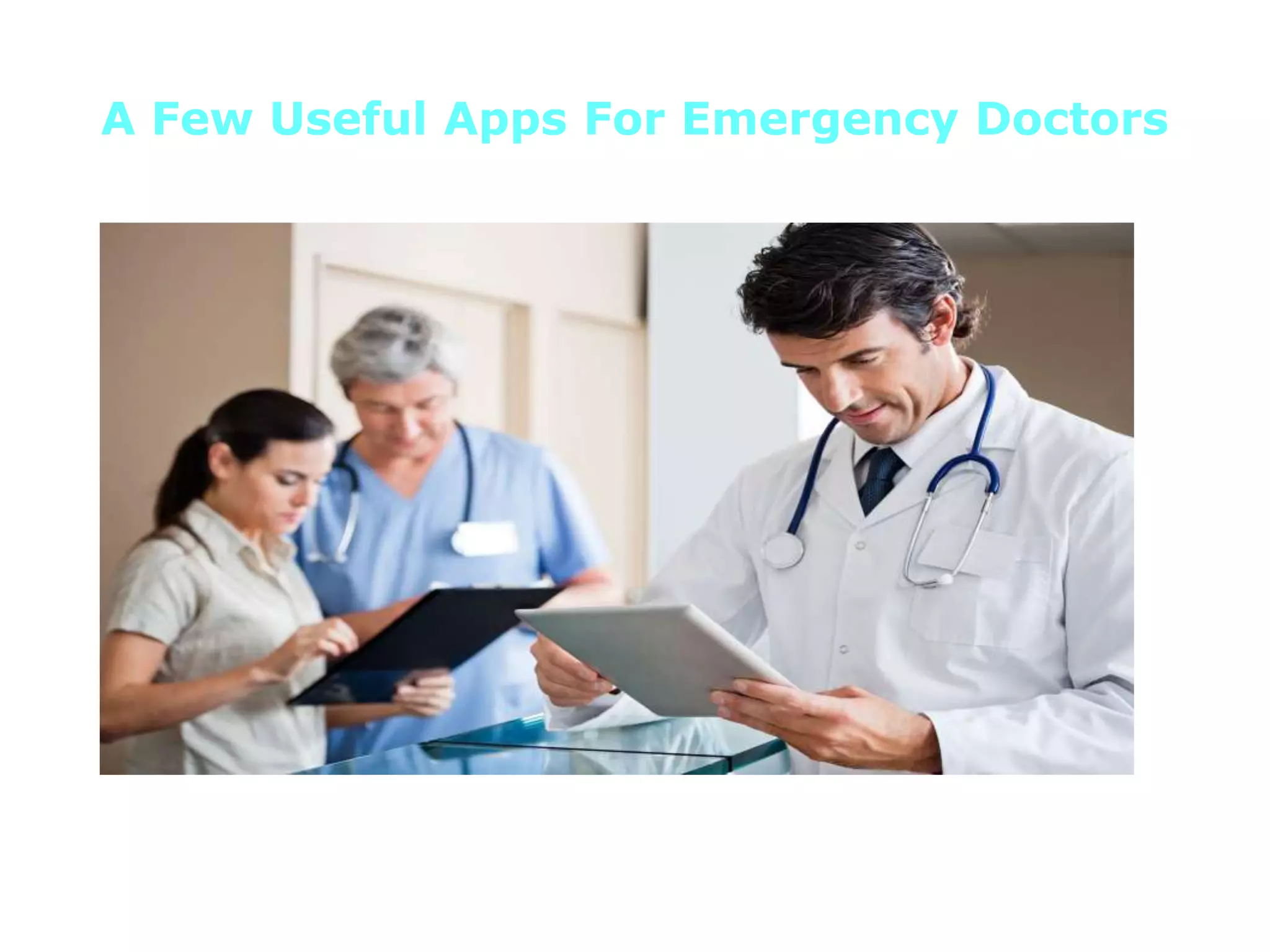 The document lists several useful mobile apps for emergency doctors, highlighting features and benefits of each app such as ultrasound guides, treatment updates, and diagnostic tools. Key apps mentioned include Sonosupport for ultrasound assistance, STD Tx Guide for CDC updates, and ERres for emergency medicine providers. The conclusion emphasizes the importance of enhancing skills in clinical research through relevant training programs offered by CRB Tech Solutions.