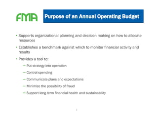 The document outlines a 5-step guide for developing an organizational budget: 1) Assemble a budget team, 2) Create a budget calendar, 3) Prepare for and conduct a budget kickoff meeting, 4) Draft the budget, and 5) Monitor the budget. It emphasizes a team decision-making approach and provides details for each step such as setting financial goals, building a budget template, forecasting expenses and revenues, monitoring variances, and creating mid-year revisions when needed. The overall process aims to support strategic planning, control spending, and ensure long-term financial sustainability.