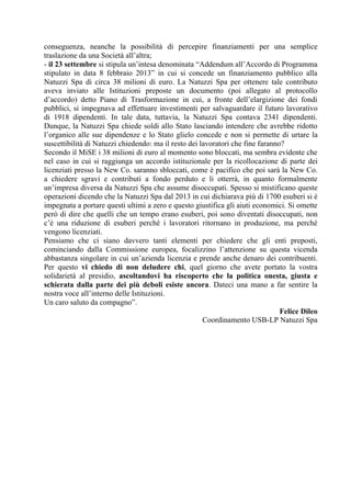 Il documento è una lettera di denuncia riguardo ai 355 licenziamenti avvenuti alla Natuzzi Spa e la creazione di una nuova società che non garantirebbe nuovi posti di lavoro. Si evidenzia come la nuova azienda sommerebbe disoccupazione esistente e sfrutterebbe fondi pubblici mentre i lavoratori verrebbero obbligati a rinunciare a contenziosi legali per essere assunti. Si richiede quindi un'interrogazione al Parlamento Europeo per indagare su questa vicenda e proteggere i diritti dei lavoratori.