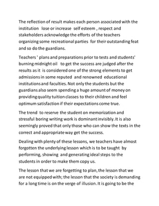 The document emphasizes the neglect of teaching essential life lessons such as discipline, good manners, and cultural values in education, focusing instead on memorization and examination scores. It highlights the detrimental impact of assimilating Western culture while neglecting Eastern values, leading to a disconnect in social norms among students. The author calls for a reevaluation of educational practices to incorporate value education and cultural awareness, encouraging collaboration among teachers, guardians, and educational stakeholders.