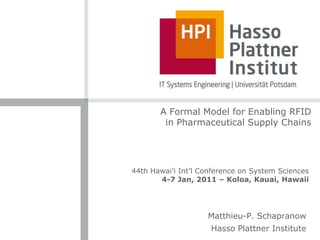 The document summarizes a presentation given at the 44th Hawai’i International Conference on System Sciences about enabling RFID technology in pharmaceutical supply chains. It describes a formal model for representing supply chain entities and roles, presents a quantitative analysis of network traffic for a sample US supply chain, and evaluates security considerations for different roles. The model accounts for relationships between business entities and handling units from individual items to transport vehicles. Network traffic is estimated at 234.92TB annually for a supply chain with 15 billion goods and 7 links. Security is addressed through authentication, on-tag mechanisms, and a proposed "service provider for anti-counterfeiting" role.