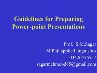 This document provides guidelines for preparing effective PowerPoint presentations. It discusses topics such as slide structure, fonts, colors, graphs, spelling and grammar. The key recommendations are to use a simple structure with 1-2 slides per minute, limit text on slides to 6 lines with 6 words per line, use readable fonts and font sizes, choose high-contrast color combinations, and ensure graphs and tables are easily readable. It also advises using consistent formatting across slides and limiting animations and distractions to keep the audience focused on the content.