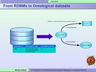 The document presents a framework for transforming archaeological databases to ontological datasets. It uses ORM reverse engineering to extract data from databases into object structures. It then applies an ECA rule-based transformation using the DOTL language to generate ontology instances from the object structures. A prototype implements the framework to transform a loomweights dataset into RDF/OWL ontology instances.