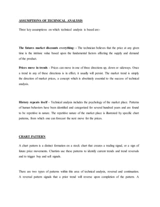 Technical analysis is the use of historical price and volume data to forecast future price movements. It is based on the assumptions that market prices reflect all known information, that prices trend, and that history repeats itself. There are various chart types used including line charts, bar charts, candlestick charts, and point and figure charts. Key aspects of technical analysis include identifying trends, measuring trend strength, finding low risk entry points, using stop losses, and exiting when trends reverse. Technical analysis focuses on price movements to predict the future, while weaknesses include subjectivity and interpretation of patterns.
