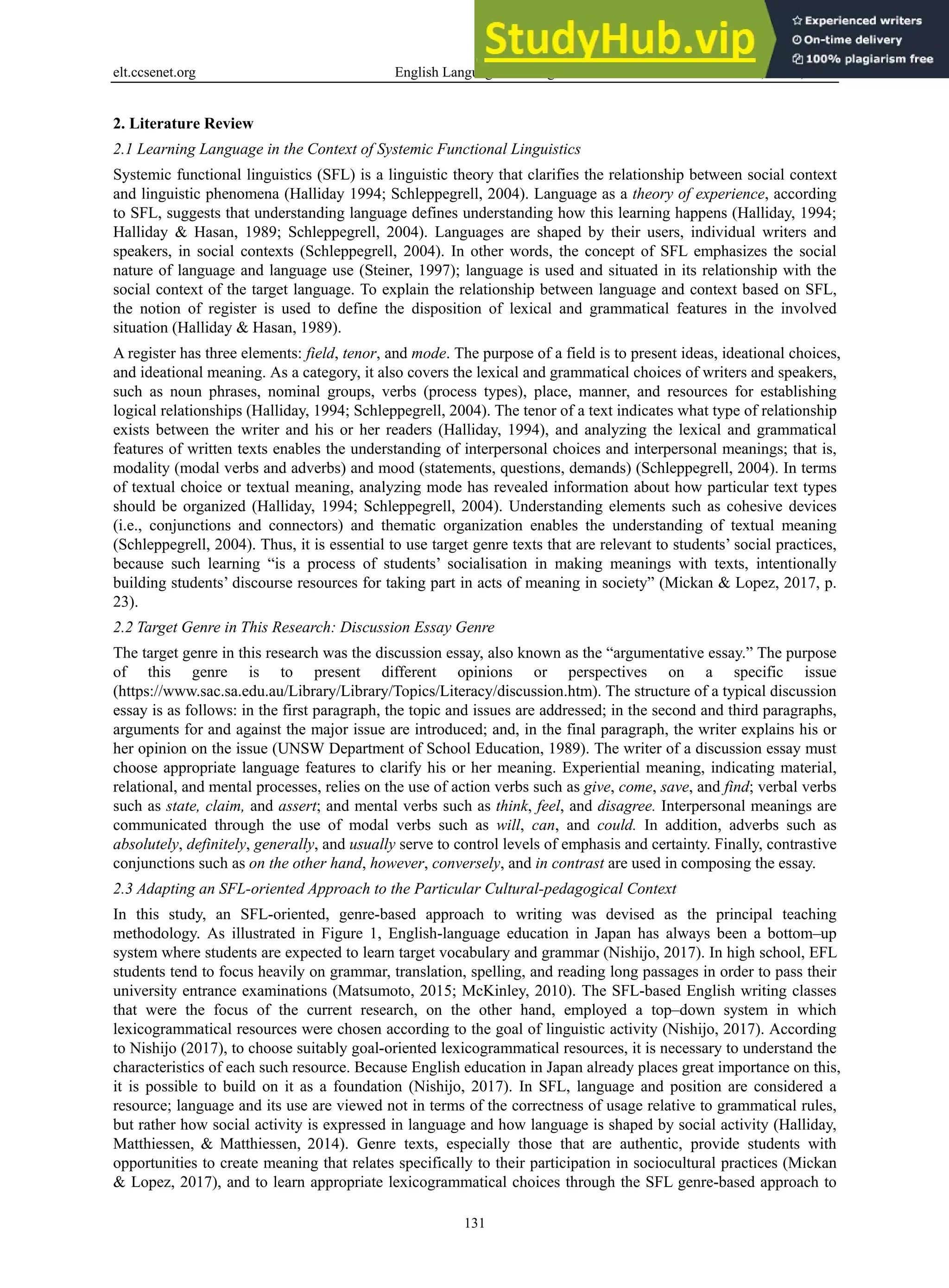 This summary provides an overview of a study that explored how 14 Japanese university students improved their understanding of genre structure and language features for writing argumentative essays through a 15-week English writing course using a genre-based approach.