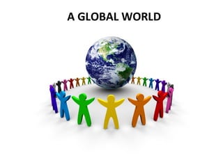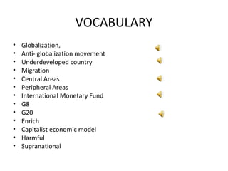 Globalization is a process of integration across geographical boundaries that affects economic, political, and cultural systems. It has created a global market where people, goods, ideas, information, and knowledge move between places thanks to new technologies like the Internet. The world is divided between developed and developing countries. There is controversy around globalization, with supporters like the IMF, WTO, G8, and G20 arguing it extends markets and benefits cooperation, while opponents like anti-globalization groups argue it imposes harmful capitalist systems and cultural dominance by powerful countries.