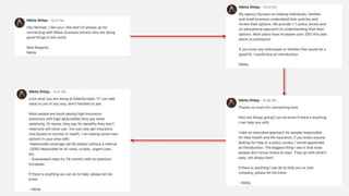 The document provides examples of messages used in a LinkedIn outreach campaign to connect with prospects and sell health insurance. The initial invitation connects on shared interests. Follow up messages thank the prospect for connecting, position the salesperson as someone who can help individuals find the best insurance options, ask if the prospect knows anyone looking for assistance, and provide an update on rising insurance costs. Later messages focus more on the salesperson's agency and capabilities, as well as new options being seen in the area.