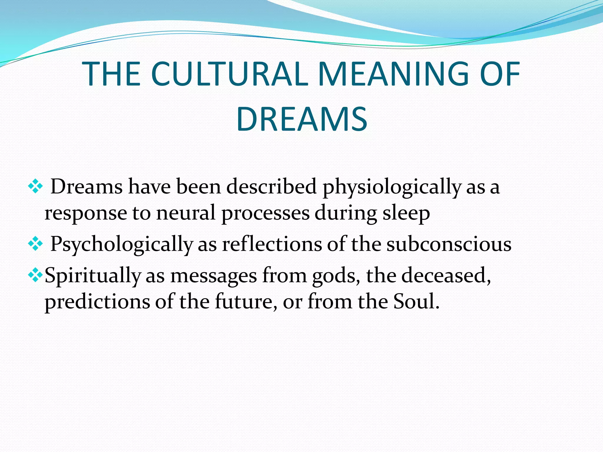 Dreams have cultural, psychological, spiritual, and physiological meanings. Psychologically, dreams are seen as reflections of the subconscious and modifications of mental schemas during sleep. Physiologically, activation synthesis theory and continual-activation theory propose that dreams result from brain activation and the interpretation of signals during sleep. Dream content often involves illogical scenarios, exaggerated memories, and emotions that help strengthen memory consolidation.