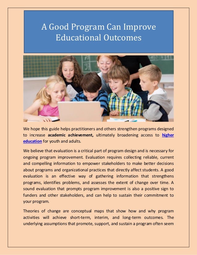 This guide emphasizes the importance of evaluation in program design and improvement to enhance academic achievement and access to higher education. It discusses the need for developing theories of change and various evaluation strategies, including monitoring, implementation, outcome, and impact evaluations. The document highlights the significance of stakeholder participation and the use of both quantitative and qualitative data in evaluating program effectiveness.