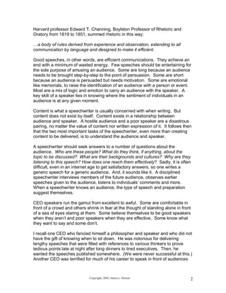 The document provides guidance on writing effective speeches for CEOs. It discusses that a good speech moves an audience to the speaker's desired conclusion. It emphasizes understanding the audience and speaker as the most important tasks. A good speech is an efficient communication that achieves its purpose with minimal wasted effort. While there are guidelines, the most important factor is understanding and adapting to the specific audience as audiences and circumstances vary widely.
