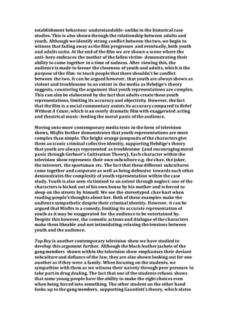The document discusses the complexity of media representations of youth compared to the simplicity of past representations. It analyzes several films and TV shows that portray both positive and negative aspects of youth, like struggles they face with poverty and neglect alongside criminal behavior. While older media focused on youth delinquency to create moral panic, contemporary works provide more understanding of influencing factors and show youth and adults overcoming conflicts. Therefore, the document argues media representations of youth have become more nuanced over time.