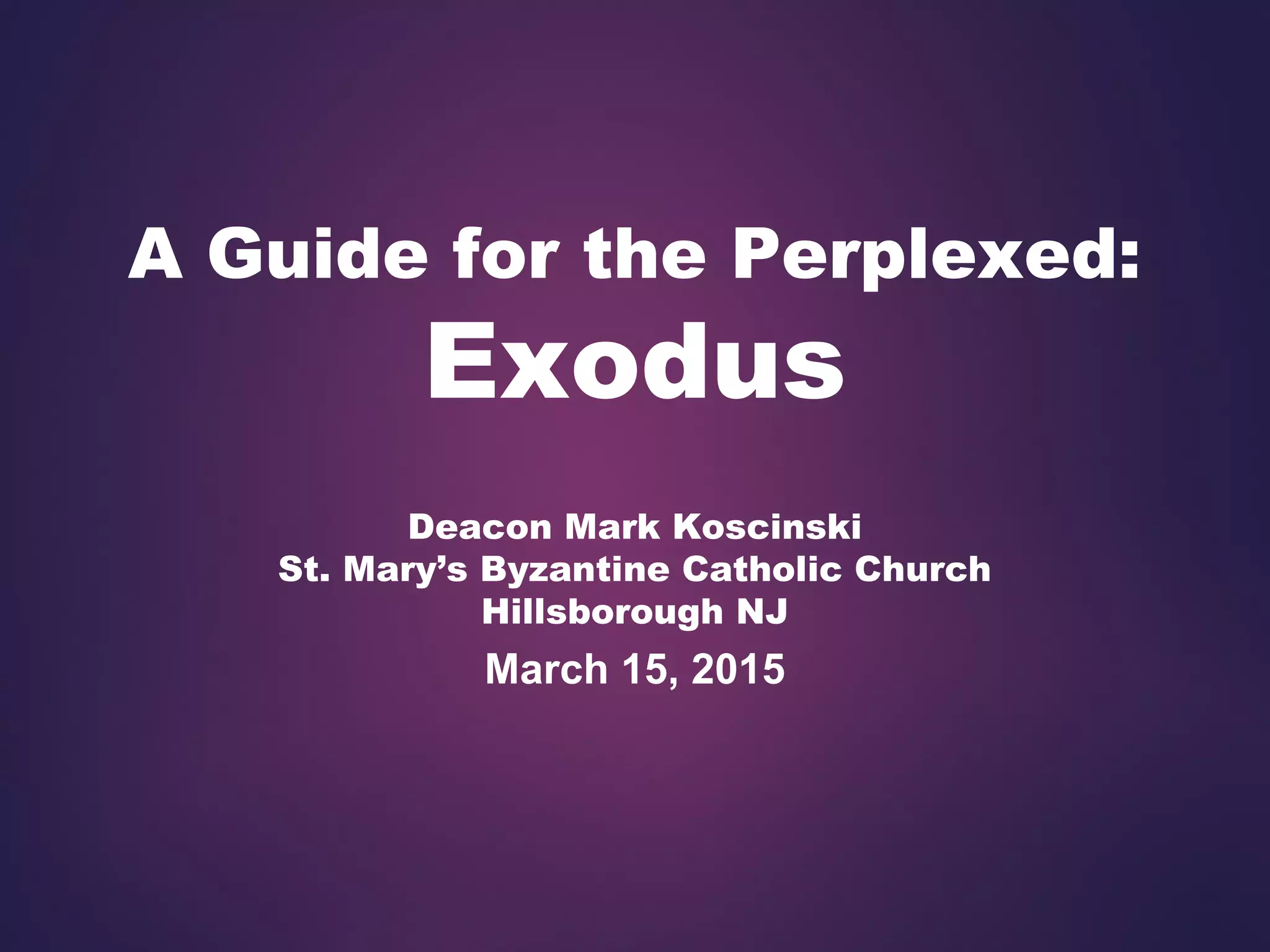 This document provides an overview and summary of the biblical book of Exodus. It discusses why Christians read Exodus, including that it foreshadows aspects of Eastern Christianity like baptism, icons, and church structure. The document outlines the key events in Exodus, from the Israelites' slavery in Egypt to their departure led by Moses and receipt of the Ten Commandments at Mount Sinai. It notes debates around the timing of the Exodus and locations like Mount Sinai. The presentation aims to help Christians understand and interpret Exodus.