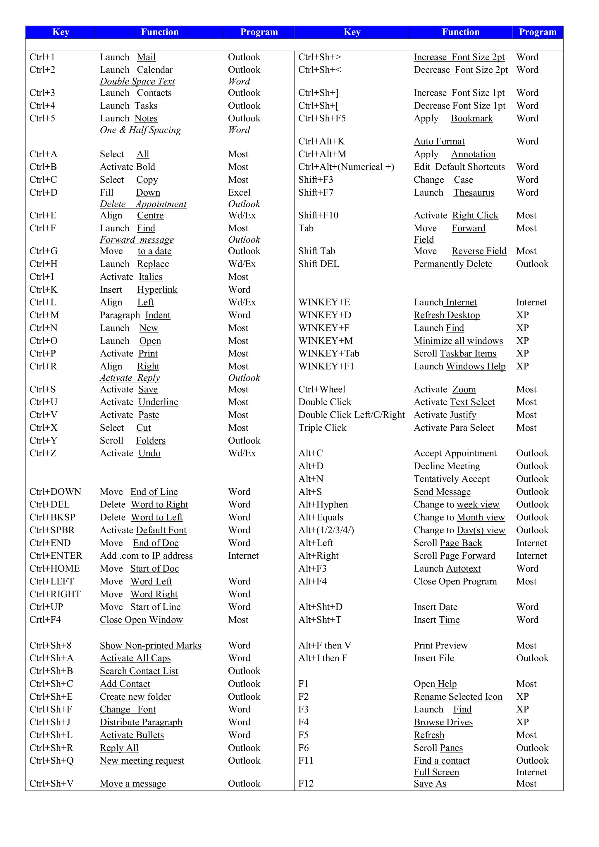This document lists keyboard shortcuts for various programs including Microsoft Office applications like Word, Excel, Outlook as well as general shortcuts for Windows and the internet. It provides over 70 shortcuts organized by the Ctrl or Alt key combined with other keys to perform common functions like copying, pasting, formatting text, navigating documents and windows, and managing emails and contacts.