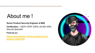 This document provides an overview of penetration testing on AWS environments. It discusses the key areas to focus on when penetration testing AWS infrastructure and applications, including external infrastructure, applications, internal infrastructure, and AWS configurations. It also outlines services that can be tested without prior approval and limitations on testing AWS-managed infrastructure. The document then covers starting penetration testing activities, accessing AWS with IAM credentials, enumerating IAM users, groups, and policies, and new methods for enumerating cross-account roles between AWS accounts.
