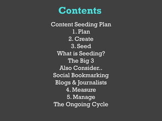 This document provides a guide to content seeding in 5 steps: 1) Plan goals and strategy, 2) Create quality content, 3) Seed content on various platforms, 4) Measure results, and 5) Manage the ongoing process. It describes how to seed content on social networks, bookmarking sites, blogs, and with journalists to generate traffic, buzz, and conversions. Key aspects are creating engaging, evergreen content with keywords and links and understanding different metrics like social shares, site traffic, and leads to evaluate success. Content seeding is portrayed as an iterative process where performance is tracked and strategies are adapted based on results.