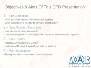 This document outlines the objectives and aims of a CPD presentation on fume extraction, covering fan selection, specification standards, control methods, and installation practices. It details necessary information for selecting fans, the importance of adhering to standards like EN 14-175, and explains different types of fume cupboards and their respective air velocity requirements. The document emphasizes the significance of correct installation and system control to ensure efficient and safe fume extraction.