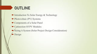 This presentation focuses on Solar Photovoltaic systems, which can be used to generate