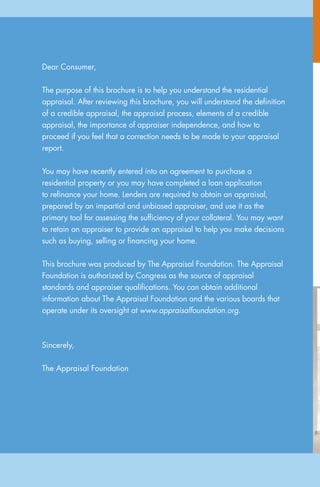 The document provides an overview of the residential appraisal process. It defines an appraisal and explains that lenders are required to obtain an impartial appraisal to assess the sufficiency of collateral for a home loan. It describes the steps of the appraisal process, including the appraiser inspecting the home, researching comparables, and developing an opinion of value using various approaches. It emphasizes that credible appraisals must comply with standards, be independent without influence, and clearly communicate the analysis supporting the value conclusion. The document advises consumers to provide any concerns about the appraisal in writing to the lender.