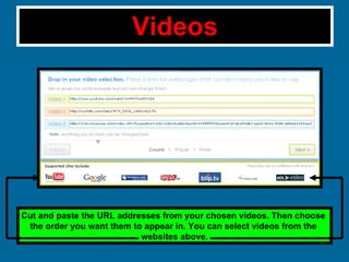 WorldTV allows users to create their own online TV channels by selecting videos from various websites, customizing the order and adding logos. Users can personalize their channel further after finishing setup by editing videos and searching for more content. Advanced settings include changing the channel name and URL, monitoring viewership statistics, and completing the television channel website.
