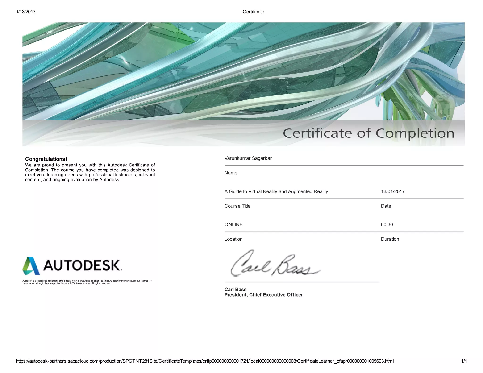 This certificate recognizes the completion of an Autodesk online course in Virtual Reality and Augmented Reality by Varunkumar Sagarkar on January 13, 2017. The course lasted 30 minutes and was designed to meet learning needs with professional instructors and relevant content. The certificate is signed by Carl Bass, President and CEO of Autodesk, to honor the achievement.