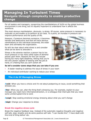 The document discusses the challenges leaders and organizations face in turbulent times, highlighting the importance of understanding VUCA (volatility, uncertainty, complexity, and ambiguity). It provides strategies for managing stress and change, emphasizing the need for leaders to foster open communication and relationships within their teams. It concludes with practical steps for individuals and leaders to navigate the complexities of the modern business environment.