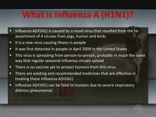 The document discusses Influenza A(H1N1), also known as swine flu. It originated from a combination of pig, bird, and human viruses. While it was originally called swine flu, the virus infecting humans is different from those typically found in pigs. The virus can spread from human to human and causes flu-like symptoms. There is no vaccine yet, but antiviral drugs can treat it. Proper hygiene and avoiding contact with infected individuals are recommended to prevent spread.